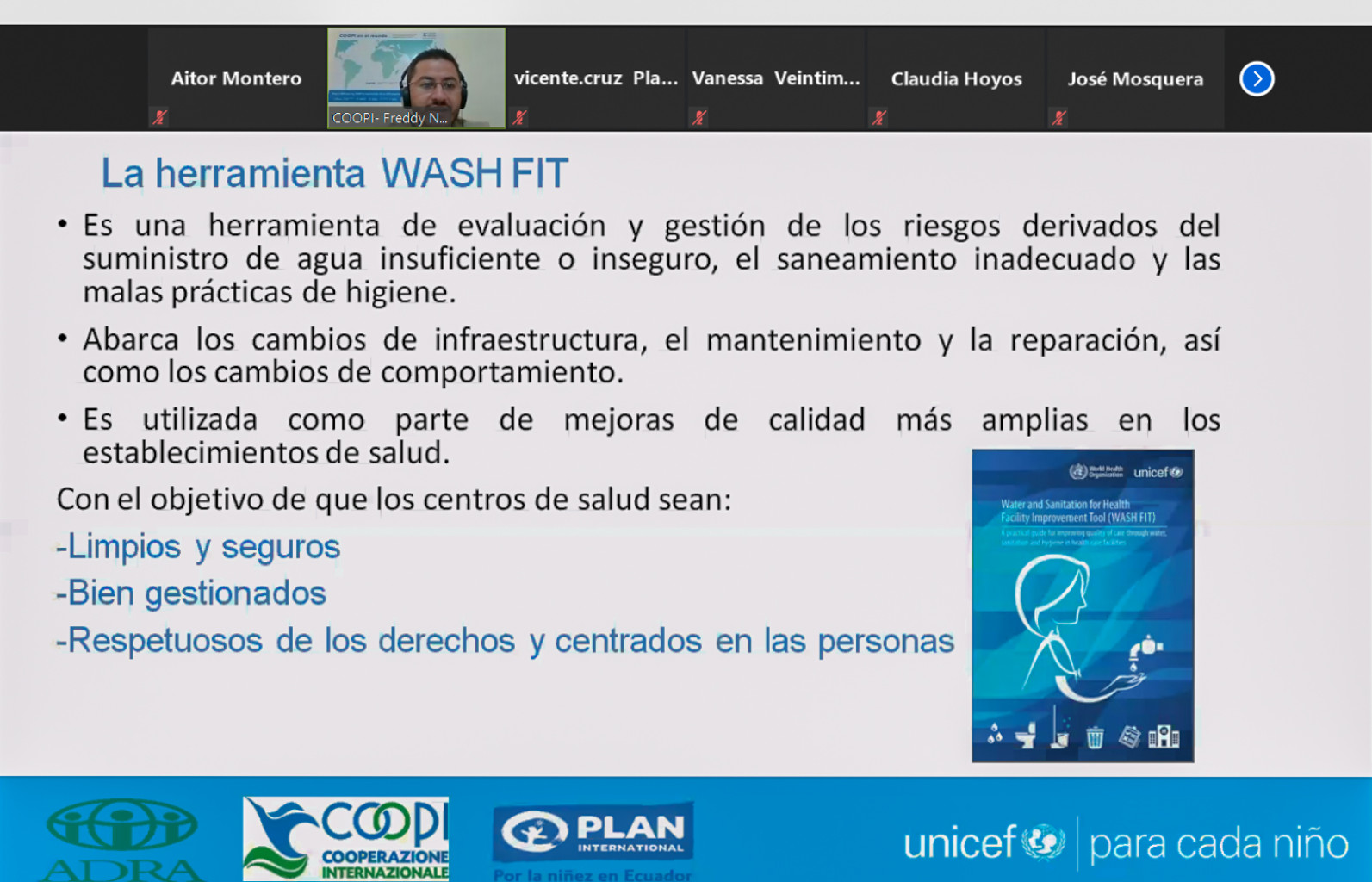 El presente proyecto busca la mejora del acceso a servicios WASH en comunidades rurales y urbanas vulnerables, en establecimientos de salud de primer nivel de atención, centros de desarrollo infantil e instituciones educativas. Por ello, dada su experiencia actual a través del proyecto “Seguros frente al COVID-19. Establecimientos de salud y población de Muisne y Pedernales fortalecidos en agua, higiene y saneamiento”, que ejecuta junto a UNICEF Ecuador, y que cuenta con el financiamiento de USAID, COOPI expuso su experticia y trabajo en torno a la metodología WASH FIT que aplica mediante capacitaciones a trabajadores de los establecimientos de salud de las parroquias donde interviene en la provincia de Esmeraldas y Manabí.