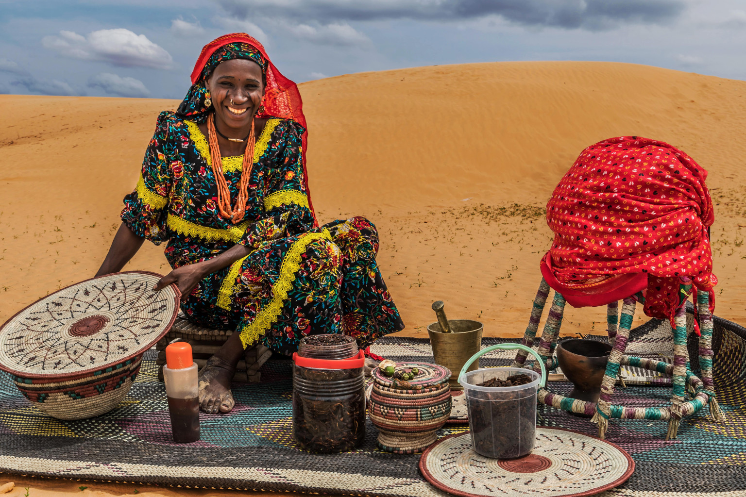 Both in everyday life and on special occasions, the women of Diffa wear pagne, a type of fabric widespread throughout Africa, characterized by different patterns and shimmering colors. Kanouri or Beri Beri women (one of the ethnic groups most present in the Diffa region) are famous for their elegance and pride; hence the choice of the name Gana Kawa (eagle) for their pagne and Hadjia (return from Mecca) for their red veil. At the same time, Peulh women (another ethnic group present in the region) identify themselves in the white (Aborawa, in the Peulh language) or black (Hanagamba) color of their clothes, and are also known for their tradition of handicraft production.